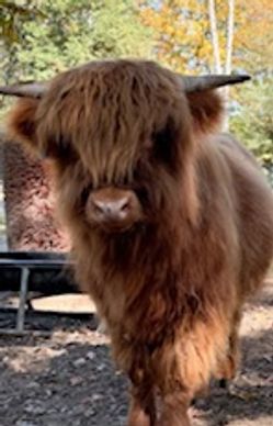 Jovie is our mini Highland Christmas baby. She's extremely curious and spunky with a beautiful coat and deep red coloring. This girl loves being brushed and loves her treats!